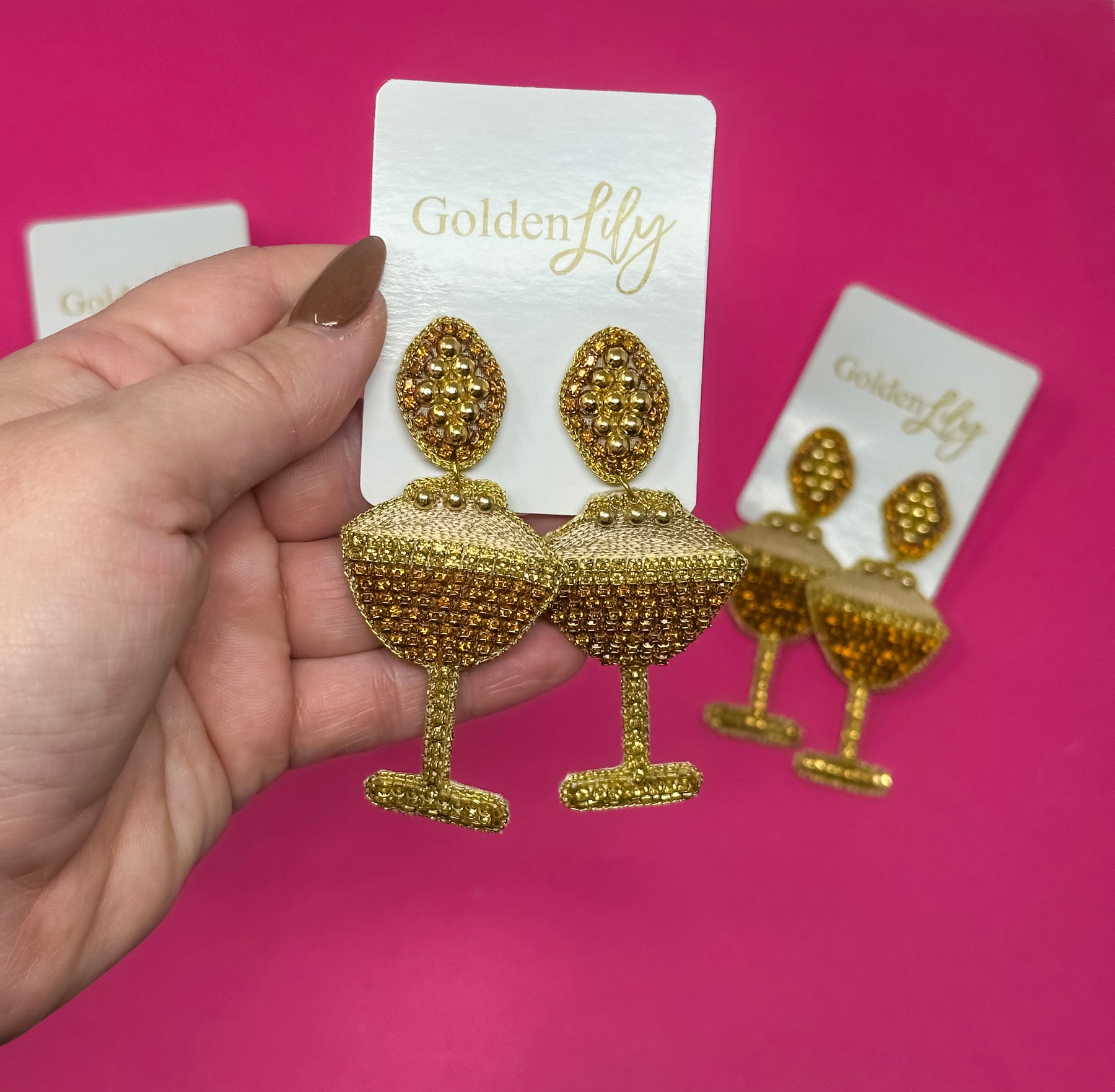 Bring a little happy hour sparkle to your look with our Espresso Martini Beaded Statement Earrings! These glam gold beauties feature a dazzling martini glass silhouette, fully embellished with shimmering beads for the perfect mix of playful and chic. Lightweight yet bold, they’re your new go-to accessory for holiday parties, girls’ night out, bachelorette trips, or any moment that calls for a touch of bubbly fun.