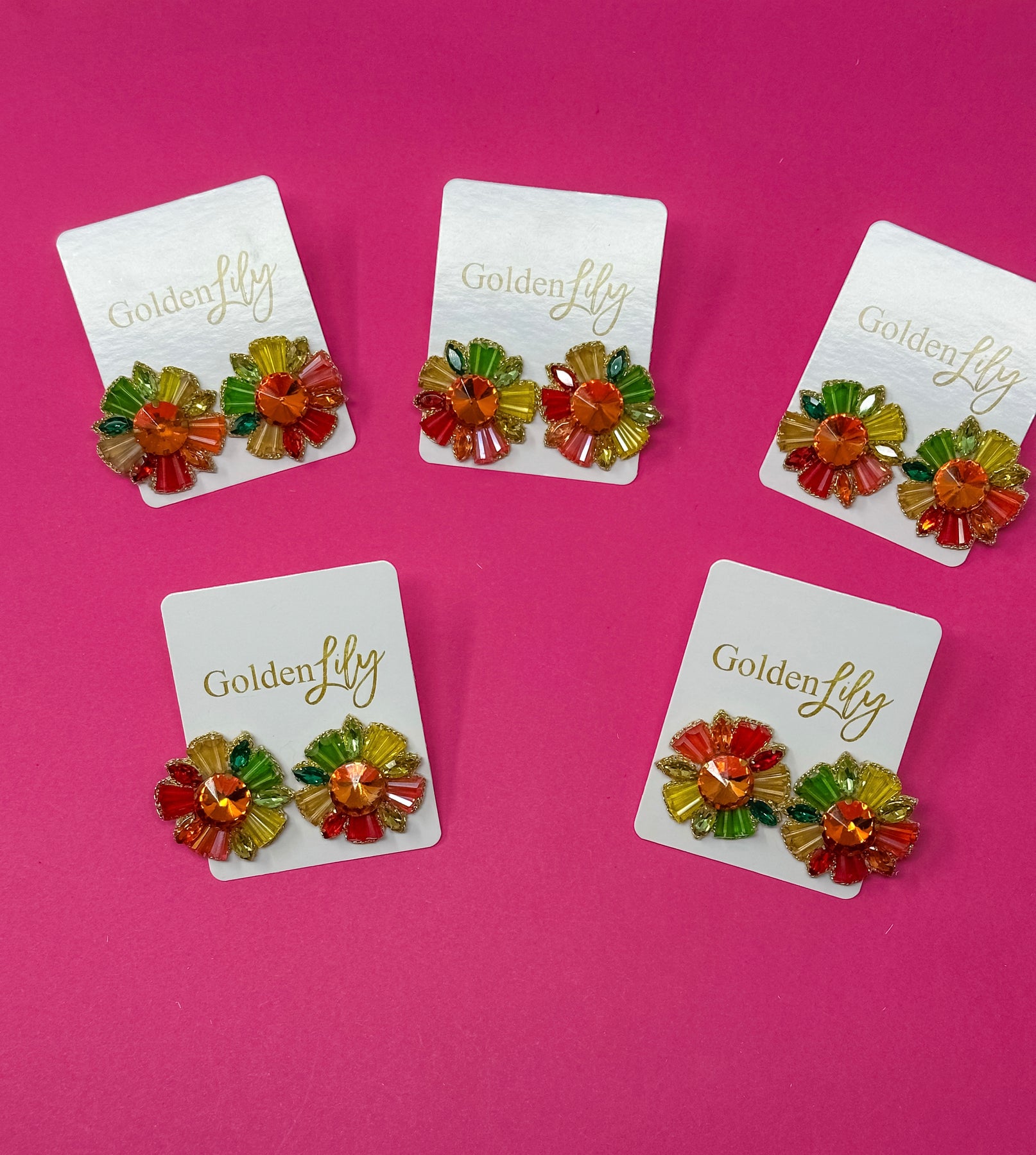 Add a burst of vibrant sparkle to your look with our Golden Lily Multicolor Crystal Flower Stud Earrings. Featuring a bold floral design in rich shades of orange, red, yellow, and green, each petal is crafted from faceted crystals for brilliant shine. Set in a gold-tone finish with shimmering accents, these statement studs are perfect for brightening up any outfit—whether you’re celebrating the season or adding a playful pop of color to your everyday style. Lightweight and eye-catching, they’re a must-have for any jewelry lover.